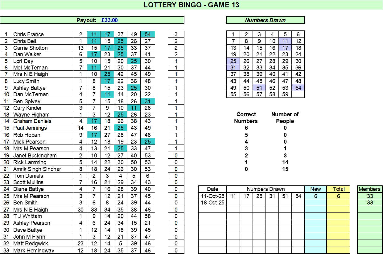 The club has been running a LOTTERY BINGO fundraising game for almost 20 years so it is well established and has generated much needed income to maintain the progress of our Junior and Senior teams. We still need more members and every new member is worth £22 per year (after payout) to the club so just 10 extra members raises £220. Over half of the income is paid out and the more members the bigger the payout, and the more funds we raise, so please join now (and ask a friend or family member to join too).