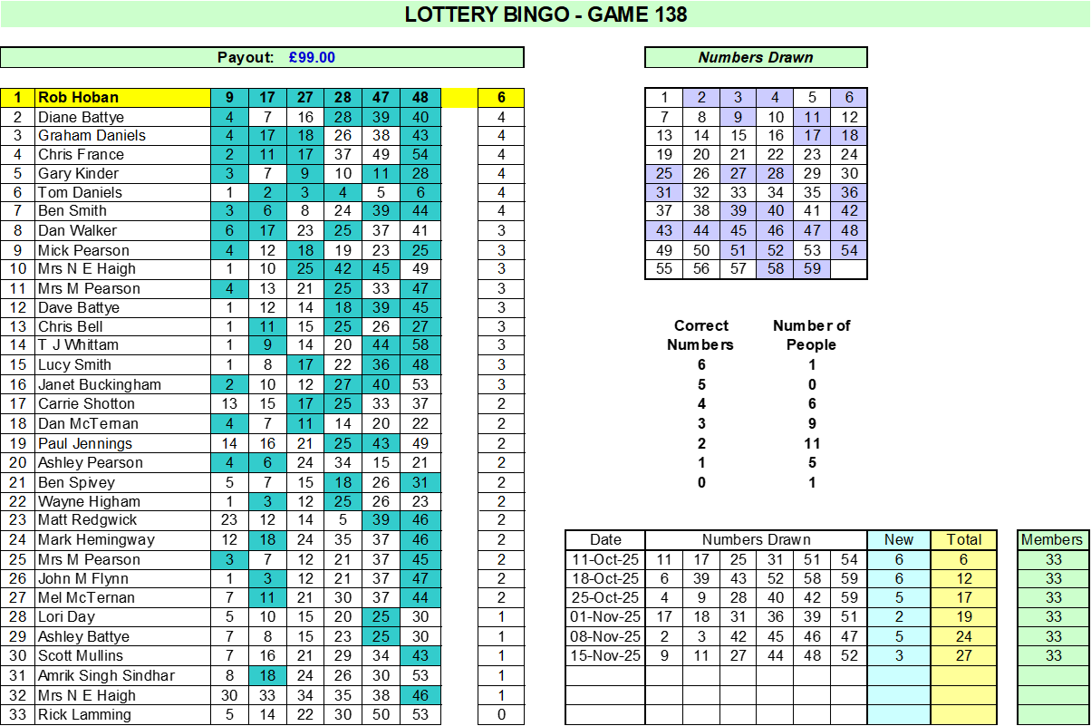 A belated congratulations to Rob Hoban who won £99 in Game 138 on 15th November.